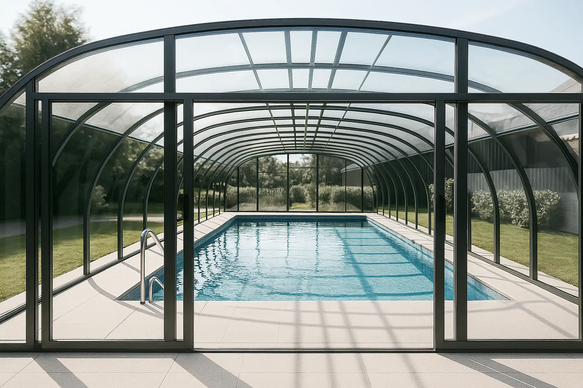 Bakom den eleganta formen döljer sig en konstruktion med fokus på säkerhet och lång livslängd. Dörren i gaveln är låsbar och gör poolområdet barnsäkert, medan flexibla tillval som ventilationsdörr, vikbar gavel eller uppvikbar front gör att taket kan anpassas efter dina önskemål. Skenorna är härdade och anodiserade för att skapa en slitstark yta med hög motståndskraft mot både nötning och korrosion. Resultatet är ett pålitligt tak som klarar både vardag och väder år efter år.
