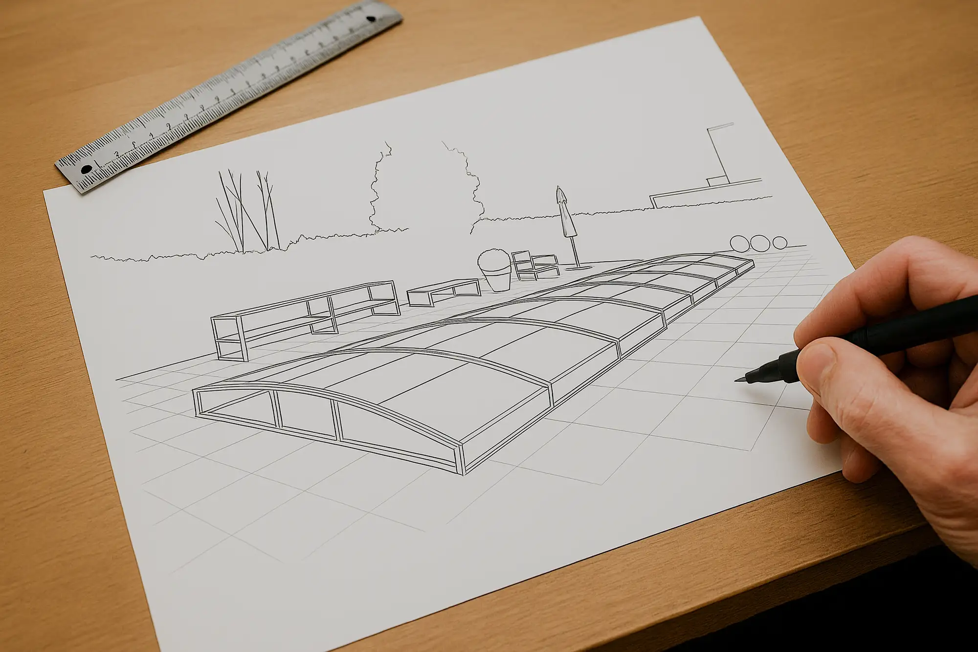 Vi börjar alltid med en noggrann inmätning och projektering på plats, därefter tar vi fram ritningar som anpassas utifrån dina önskemål. Varje detalj, från materialval till utformning, formas för att möta just dina behov. Resultatet blir ett pooltak som inte bara skyddar din pool, utan också blir en naturlig del av ditt hem och din livsstil.